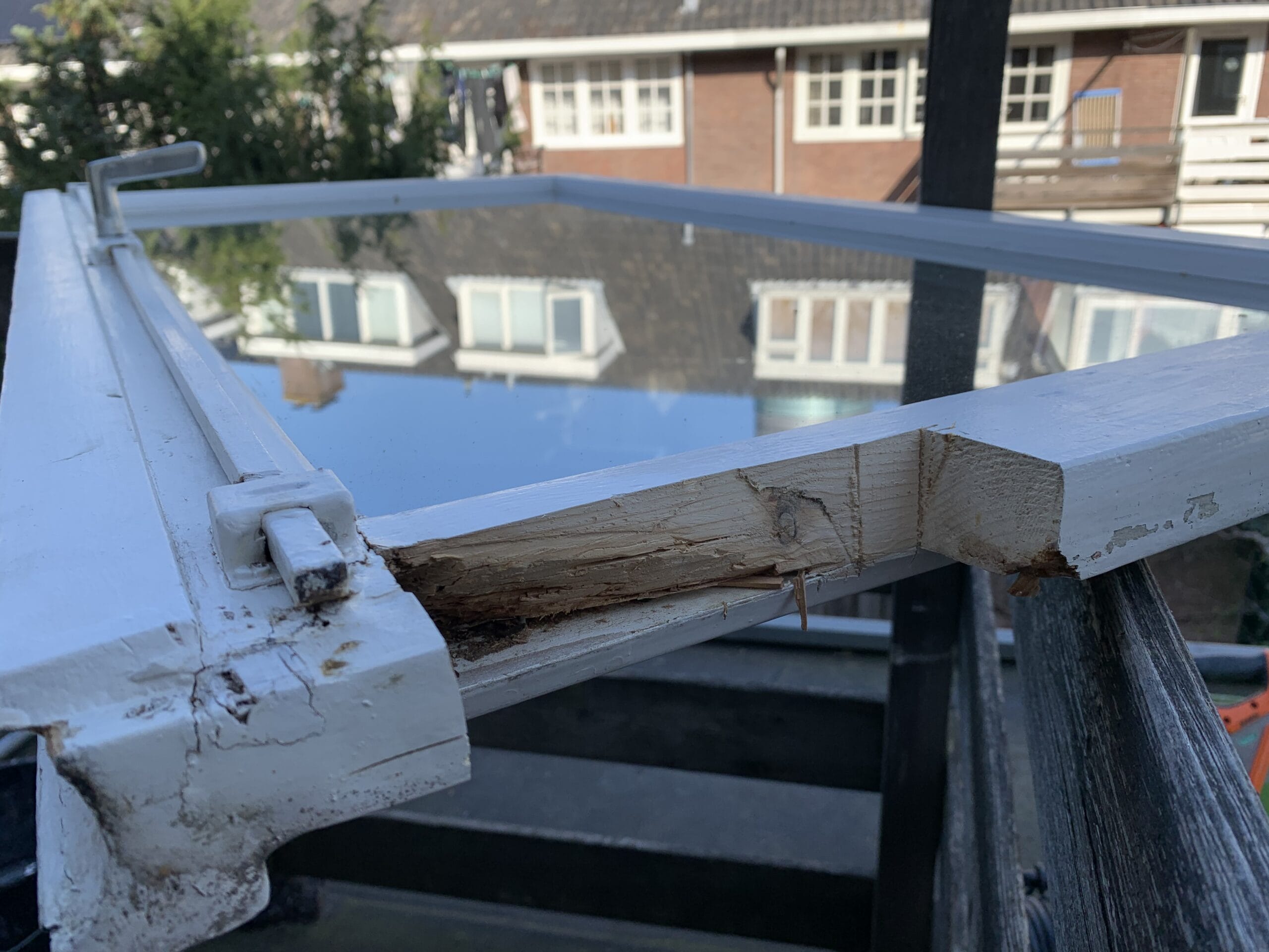 Houtrot sanering slaapkamerraam, nieuw hardhout in lamineren met epoxy.